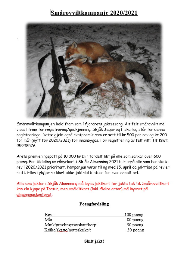 Informasjon om smårovviltkampanjen 2020-2021. Stort sett same opplegg som fjorårets, men skotpremie på mår blir innført. Alle som jaktar i almenninga må løyse jaktkort før jakt.